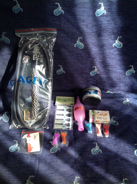 Пришла посылка: KM World cup chiller, колба, чаша, шланг, щипцы, уголь и две пачки табака(Nakhla, AF Gold). Всё отлично! Посылка шла 9 дней. Всем доволен, Кальян великолепен. Табак свеж и ароматен.